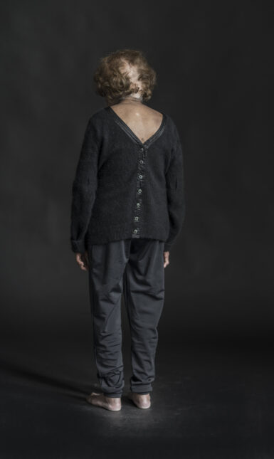 The journey made by Van Mosselaar and her mother represents their shared experiences as mother and child both literally and figuratively. Literally because they went on a journey to Indonesia together and figuratively because of their similar identity. In the photograph below (fig. 1), we see Wenzel standing against a black screen, facing away from the camera. She is wearing a black cardigan that is buttoned the wrong way around which represents the confusion that came with her dementia. Van Mosselaar is connected to this photograph as a photographer, a viewer and as the daughter of Wenzel. All three of these connections are because of a metaphorical umbilical cord. In these three roles, Van Mosselaar remembers the past moment and shares the experience of that moment with her mother in the photograph. This past moment refers to Wenzel’s confusion and struggles with dementia but also the literal moment of the photograph: Wenzel posing for her daughter.